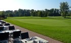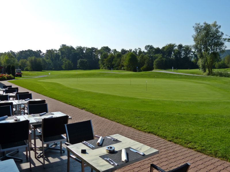Vom Restaurant aus geniesst man die Abendsonne mit Blick auf ein sattes, gepflegtes Putting-Grün.